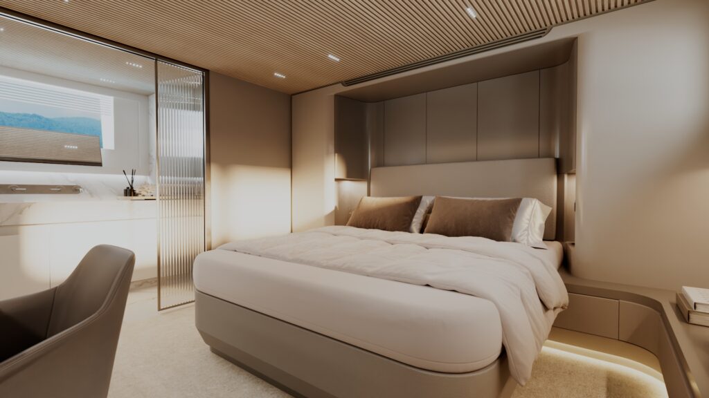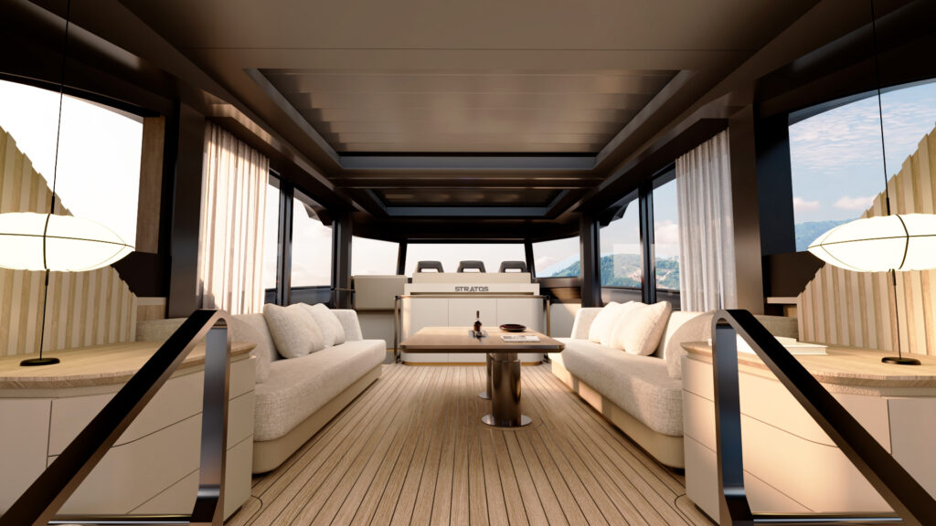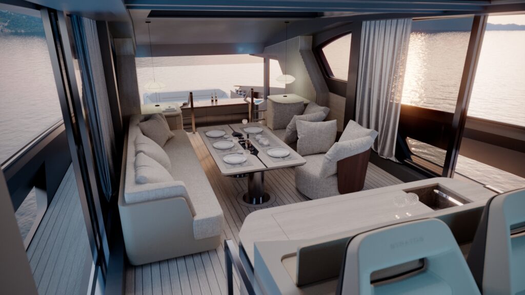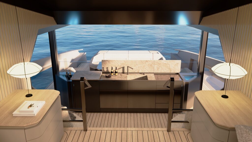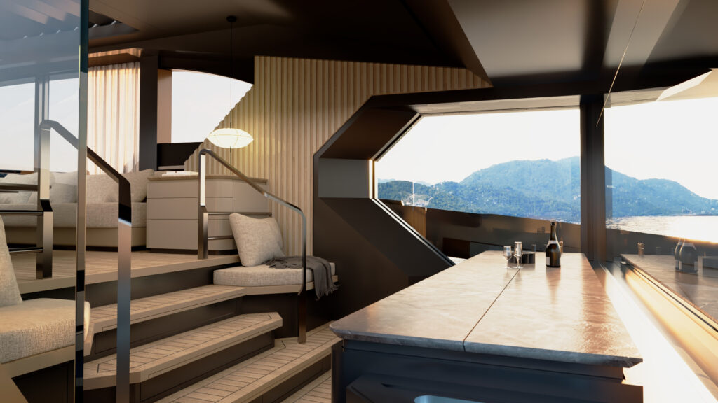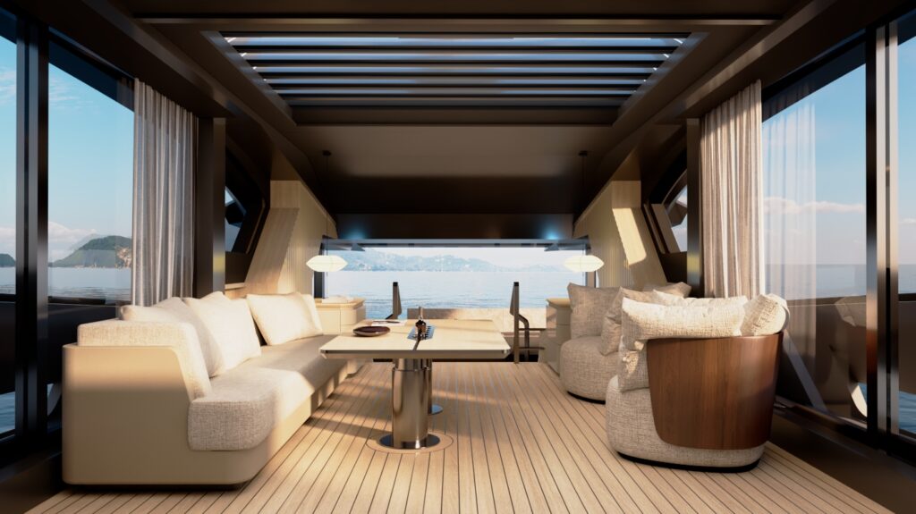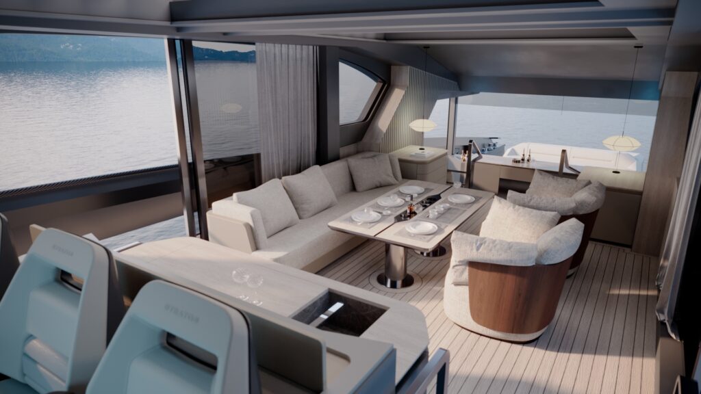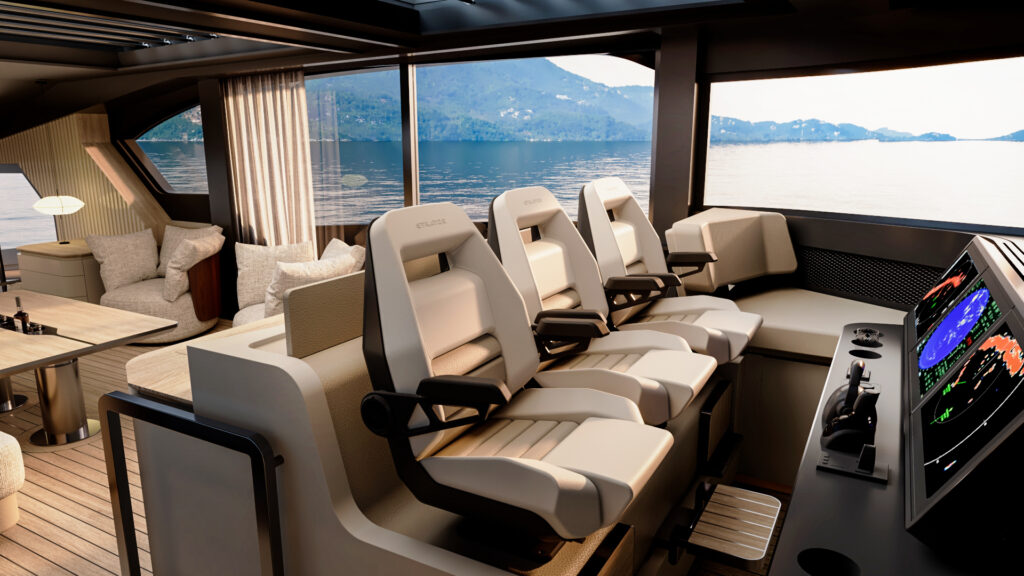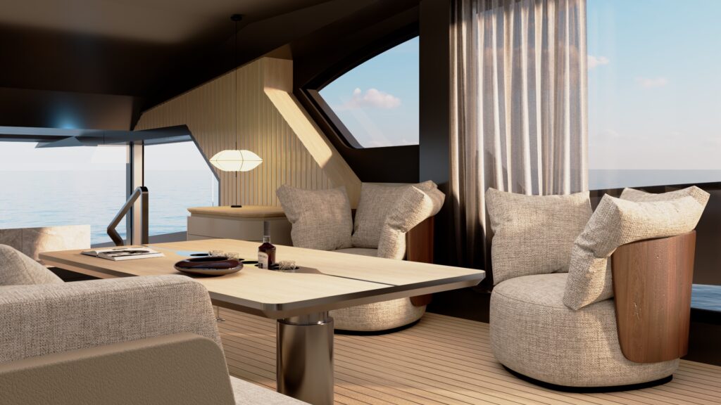 Generous natural light floods the interior, while uninterrupted ocean views ensure a seamless connection with the sea, whether seated or standing. Every element is designed to move with the surroundings, enhancing the sense of freedom on board.