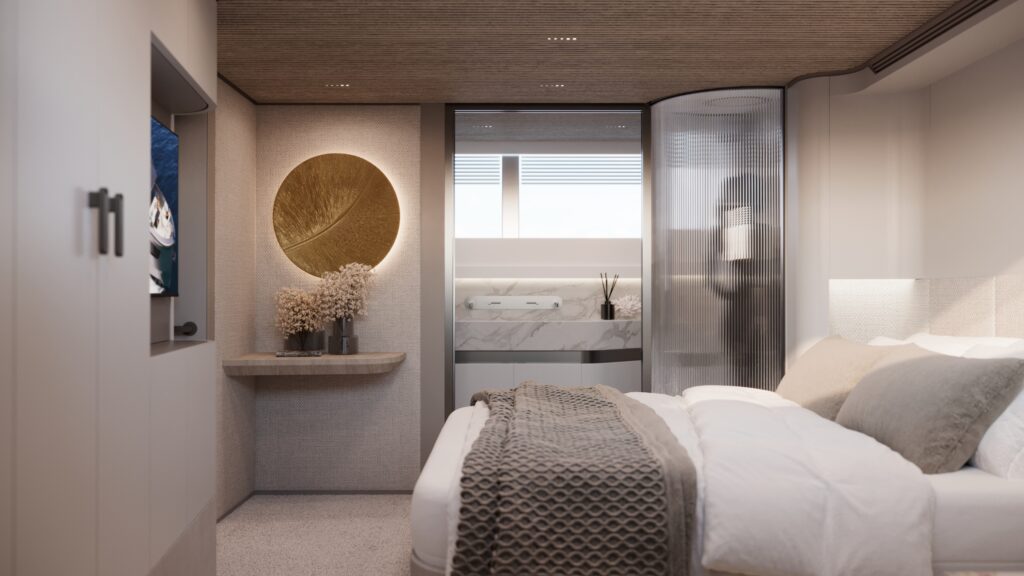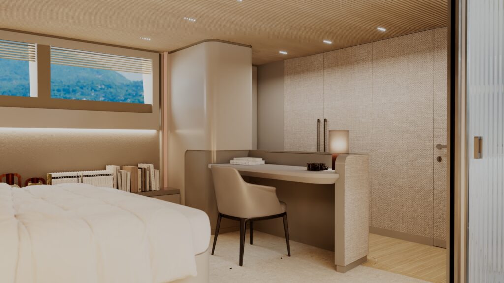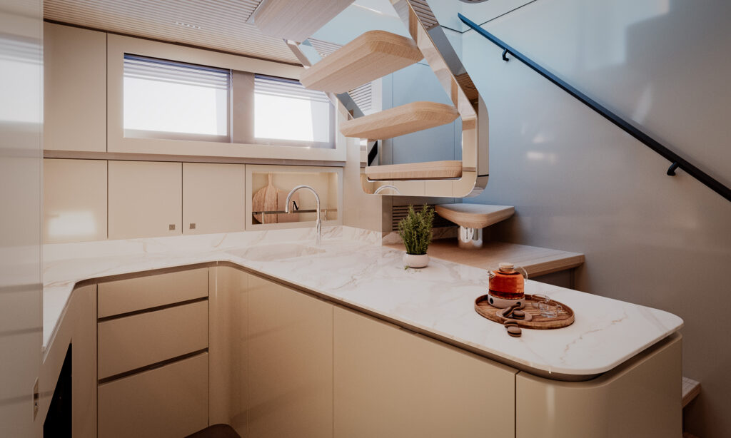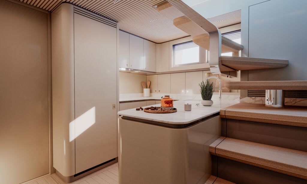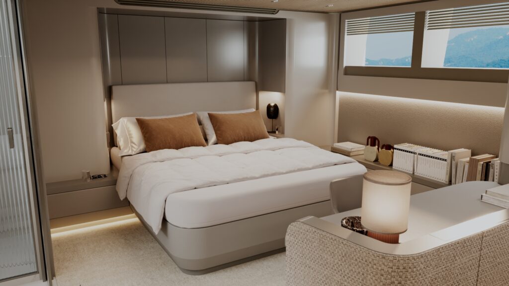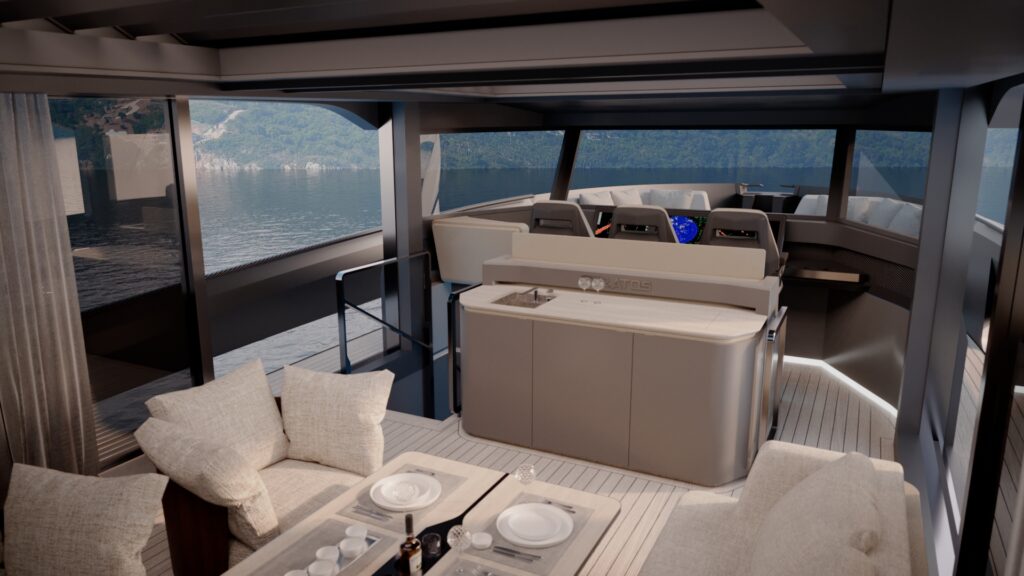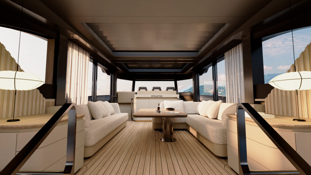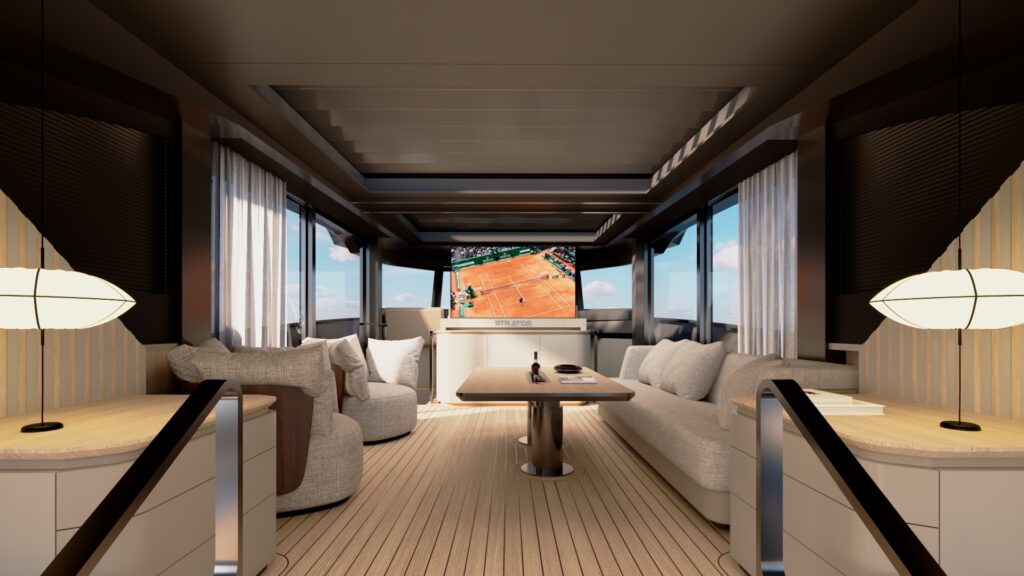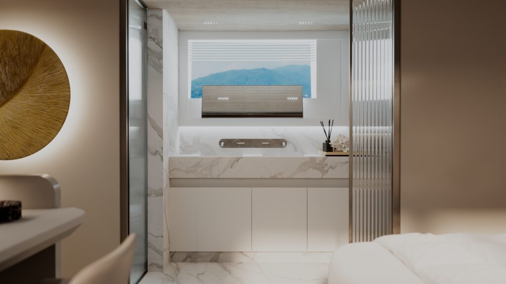 Generous natural light floods the interior, while uninterrupted ocean views ensure a seamless connection with the sea, whether seated or standing. Every element is designed to move with the surroundings, enhancing the sense of freedom on board.