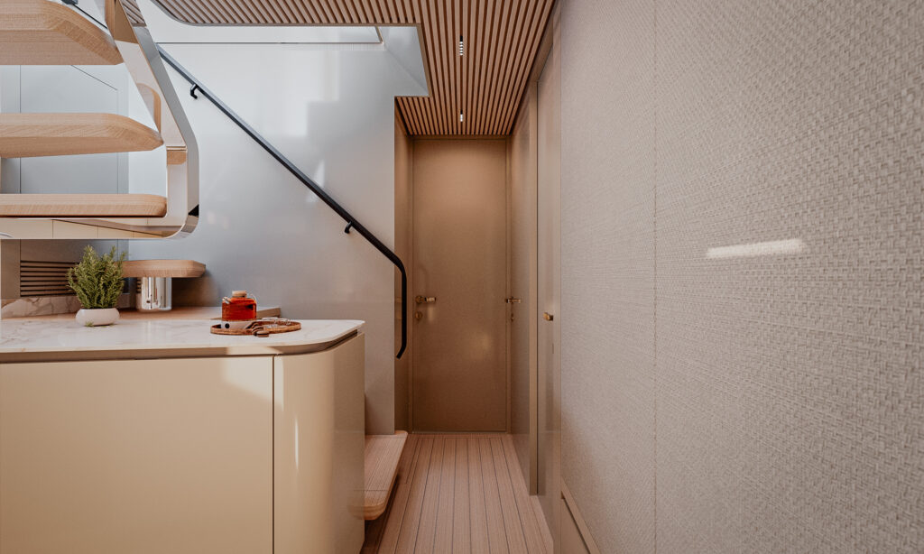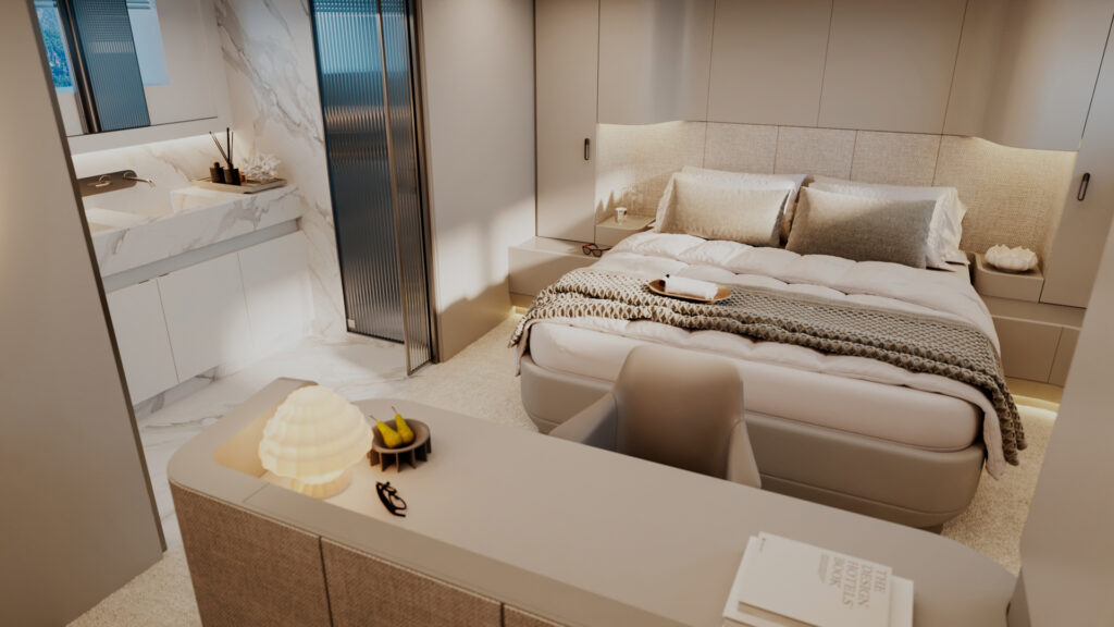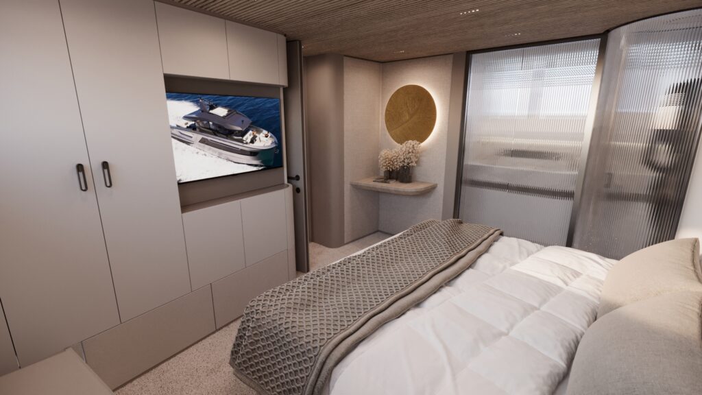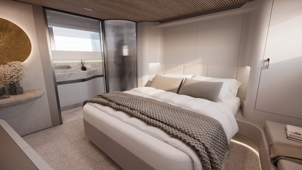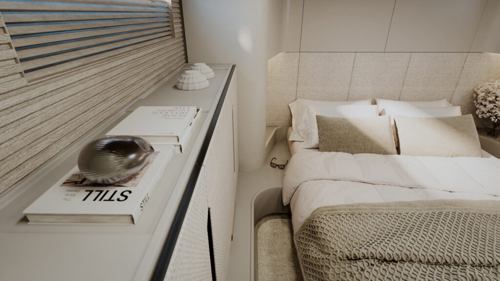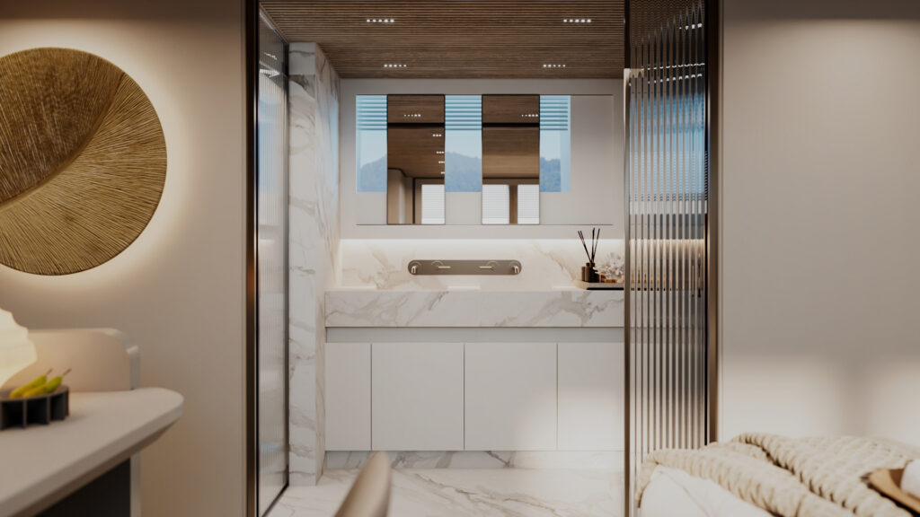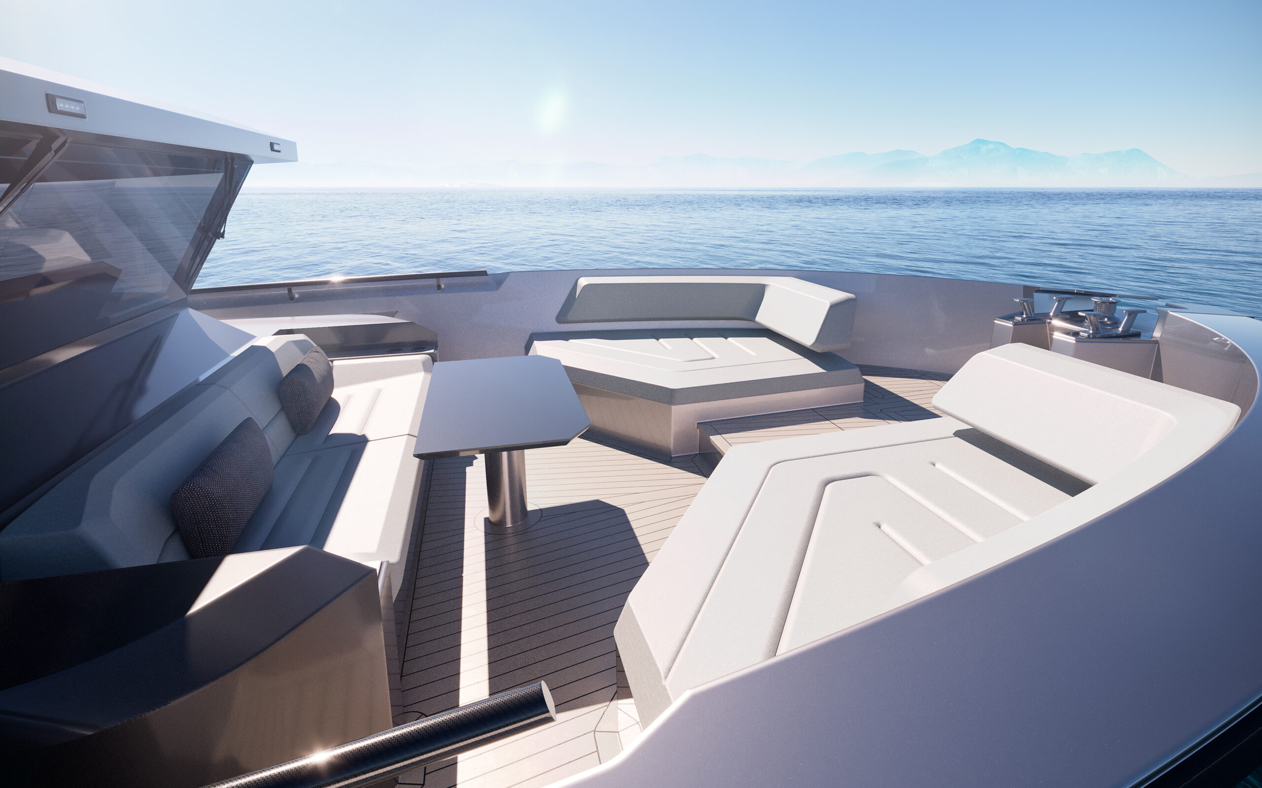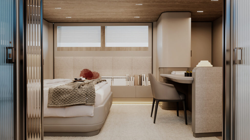 Generous natural light floods the interior, while uninterrupted ocean views ensure a seamless connection with the sea, whether seated or standing. Every element is designed to move with the surroundings, enhancing the sense of freedom on board.