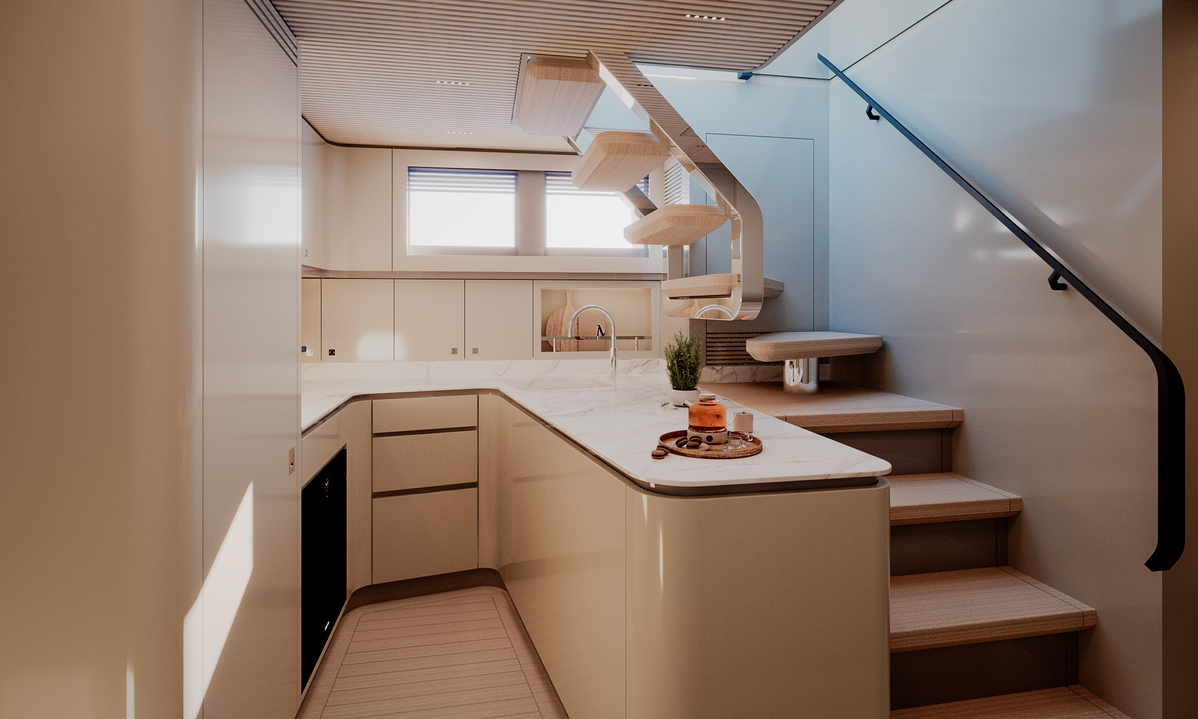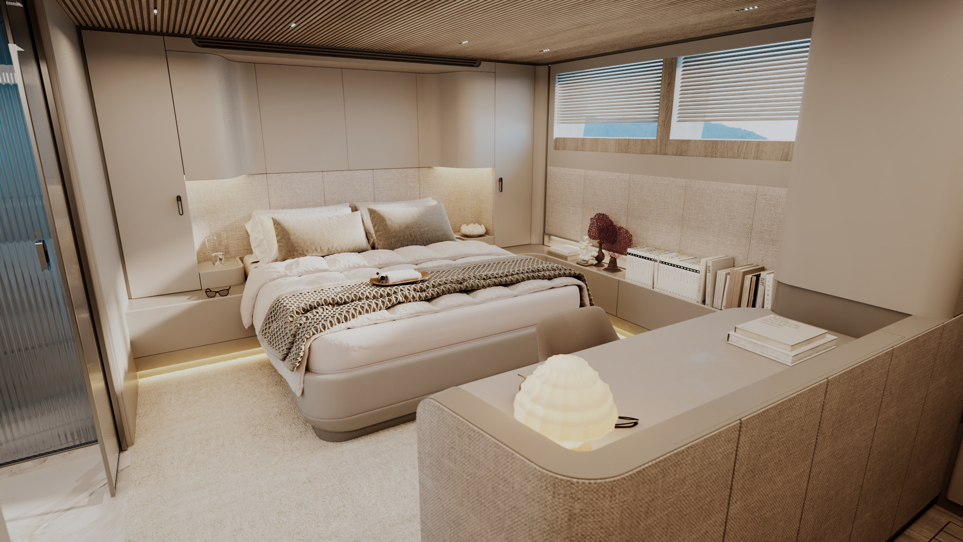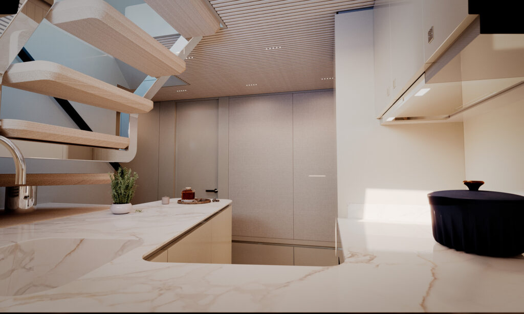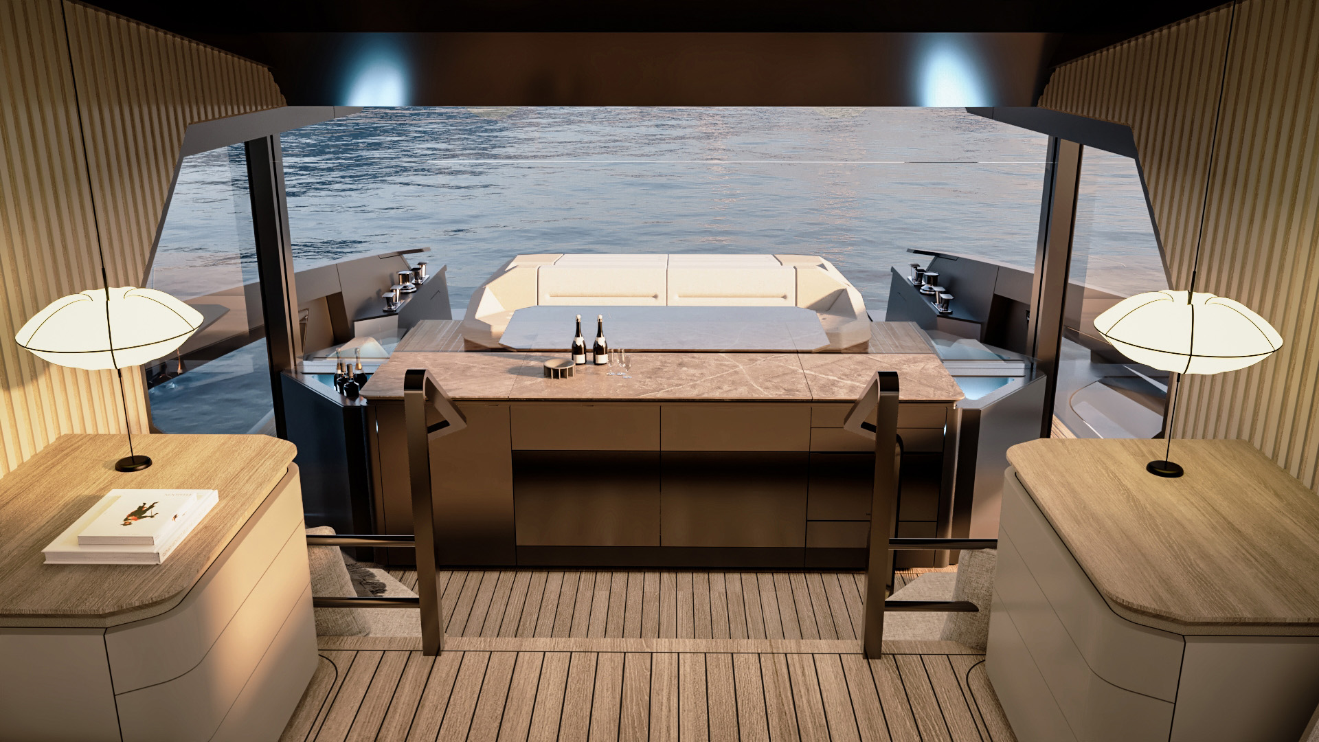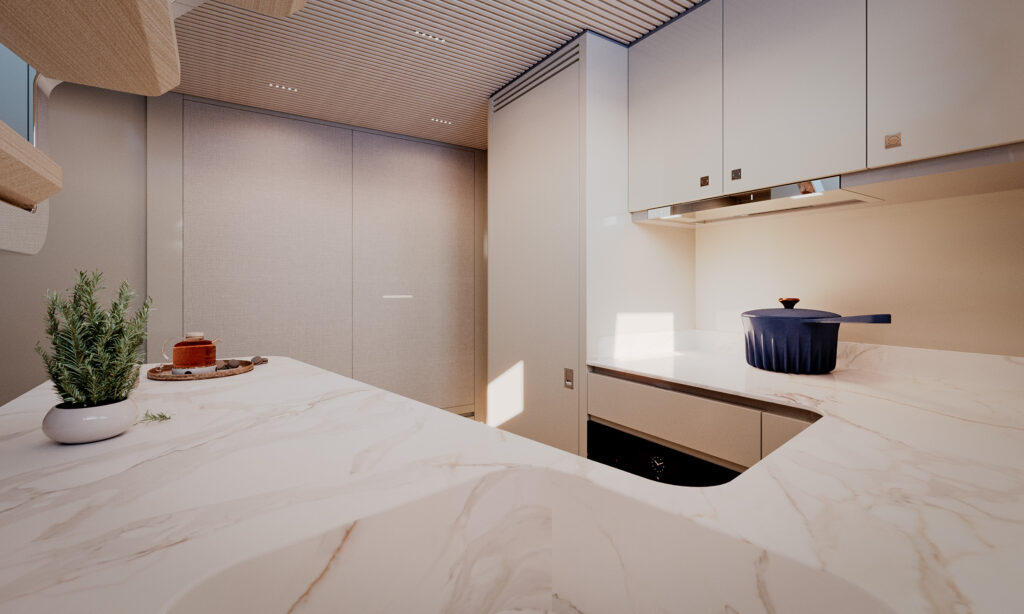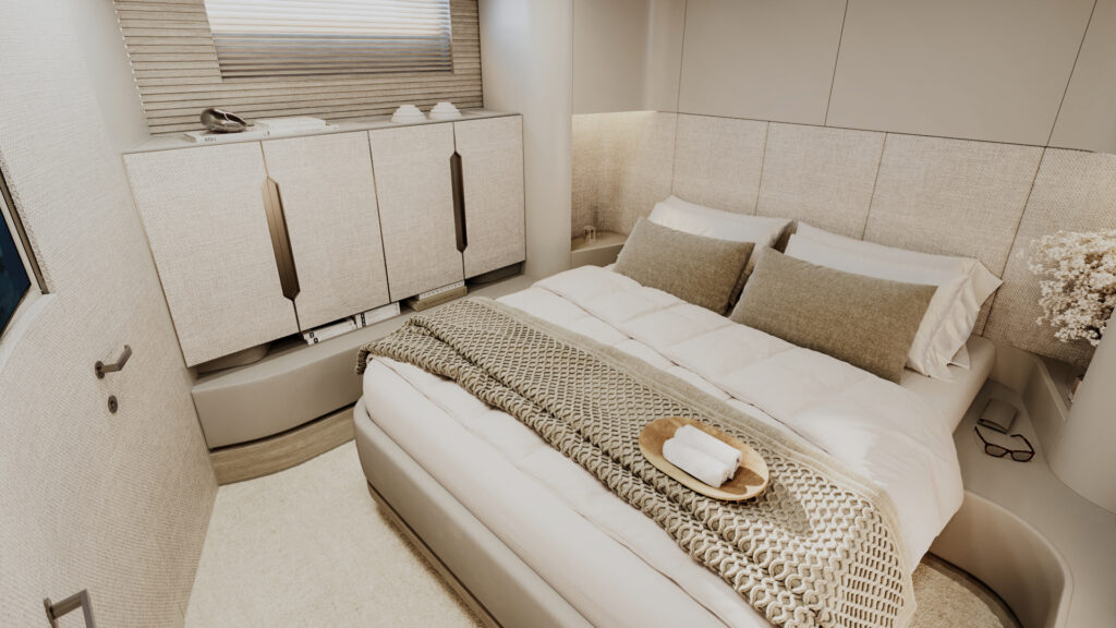 Generous natural light floods the interior, while uninterrupted ocean views ensure a seamless connection with the sea, whether seated or standing. Every element is designed to move with the surroundings, enhancing the sense of freedom on board.