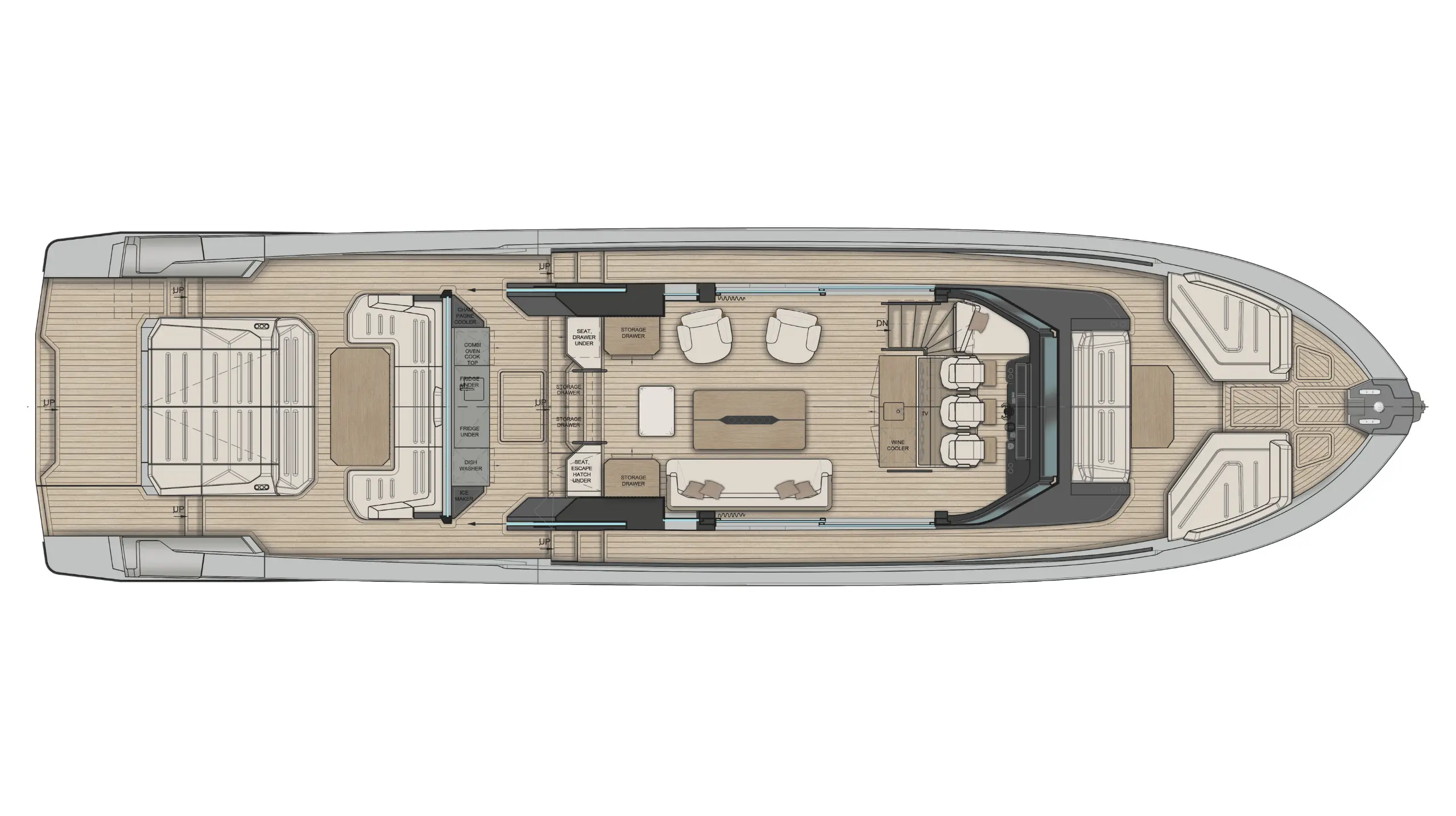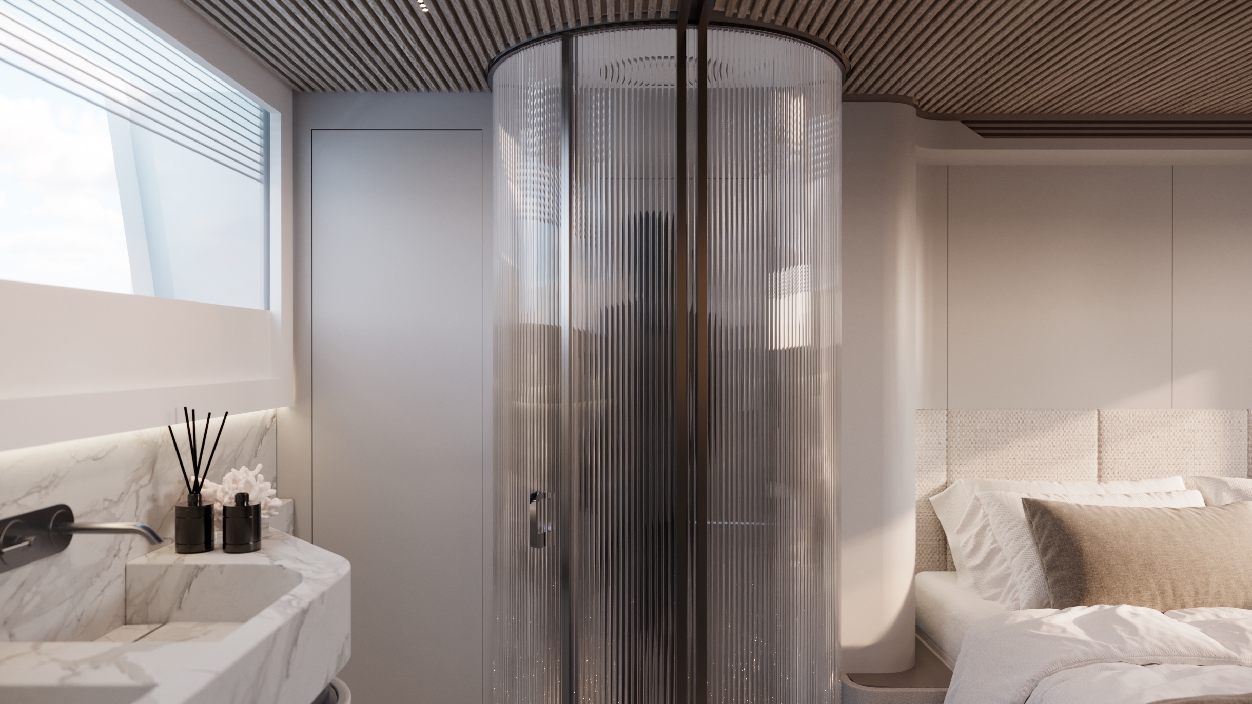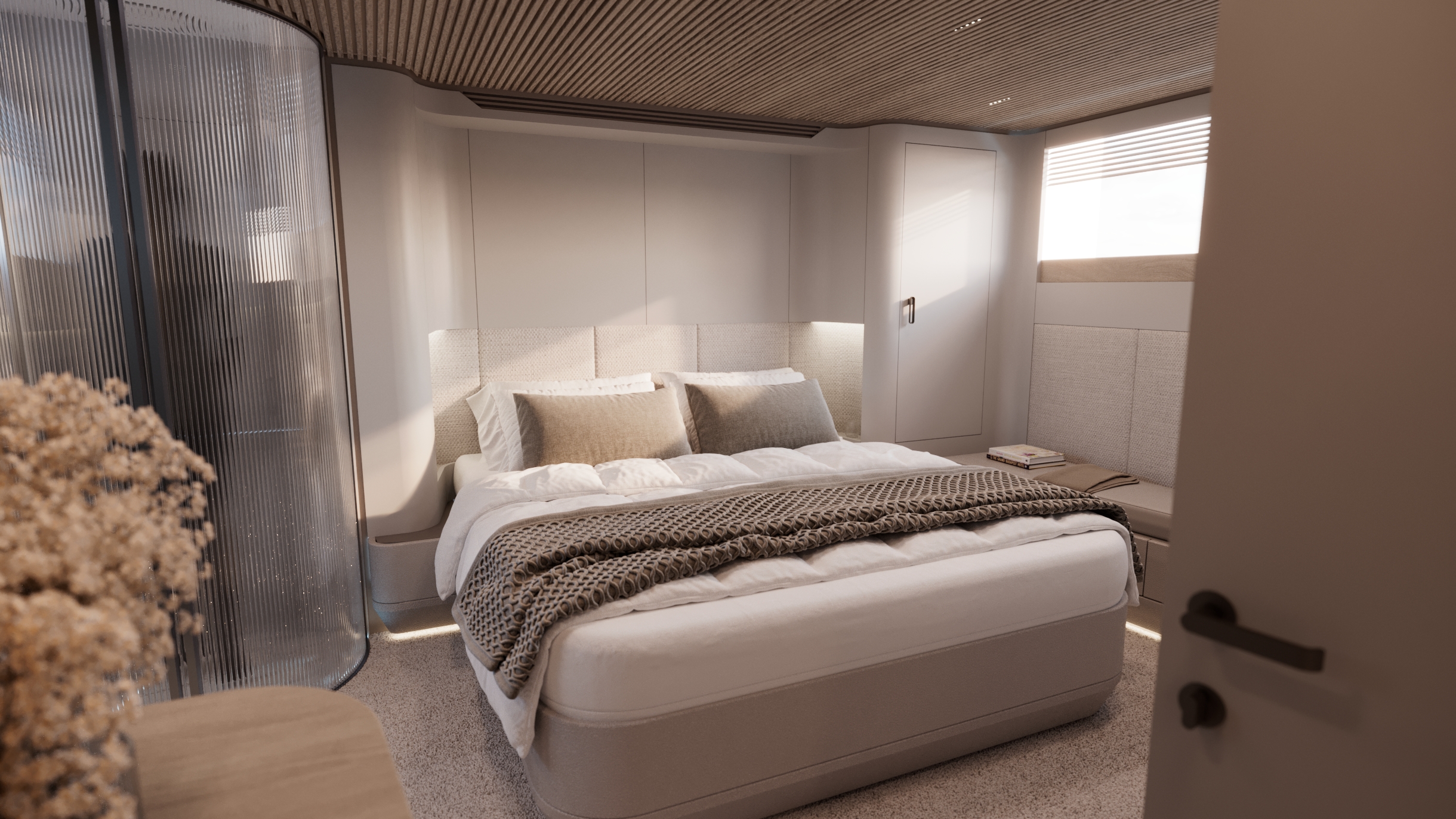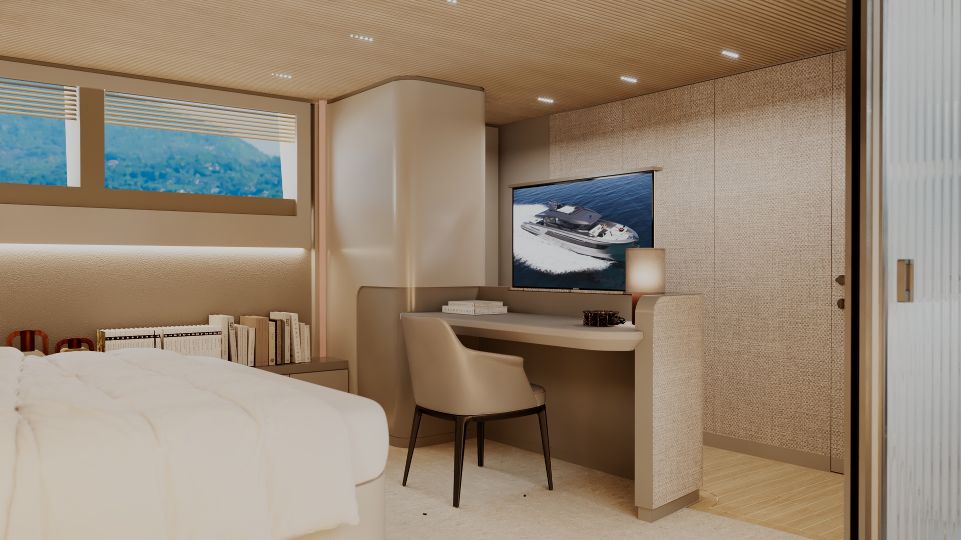 Generous natural light floods the interior, while uninterrupted ocean views ensure a seamless connection with the sea, whether seated or standing. Every element is designed to move with the surroundings, enhancing the sense of freedom on board.